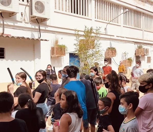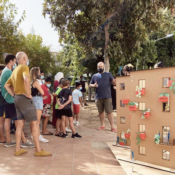 “Mira, mamá, esta soy yo”, contaba Daniela a su madre. Una bailarina en medio del bosque urbano, se asoma a la fachada de un edificio de madera decorado con piezas de papel. “Nos hicieron una foto y yo he creado la silueta”, continúa contando mientras que el resto de invitados, alumnado, familiar