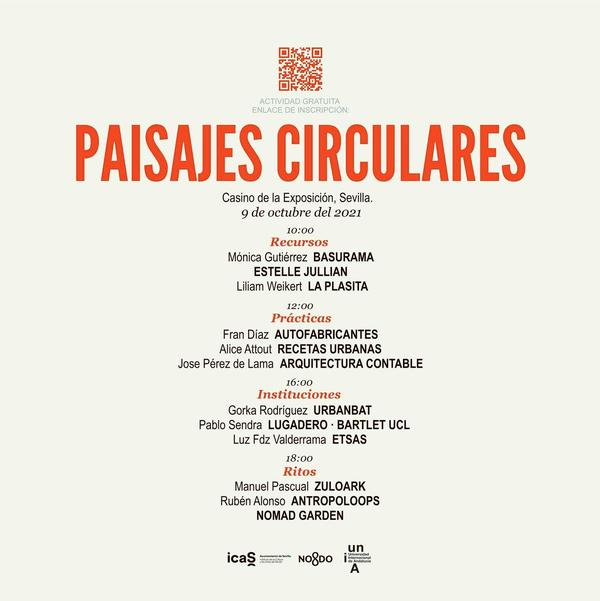 El sábado 9 de octubre en los jardines de la exposición tuvo lugar el encuentro Paisajes circulares. Un diálogo promovido por el ICAS y la UNIA y en el que participaron Mónica Gutiérrez (Basurama), Estelle Jullian, Lilian Weikert (La Plasita), Fran Díaz (Autofabricantes), Alice Attout (Recetas ur